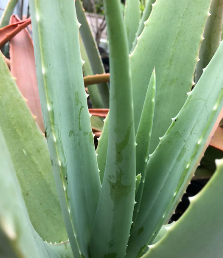 Yellow or orange bell-shaped flowers appear on mature plants. Green/grey fleshy spear shape leaves with spiny edges. Medicinal; the gel from the centre of the leaf can be applied to minor burns.